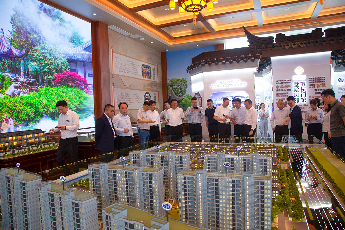 参观团一行还至双方联袂共筑的中洋吴越人家临时品鉴馆进行了参观考察,钱晓明详细地介绍了中洋吴越人家项目的文化渊源、苏州园林特色、天地墅院及宽幕大平层的产品规划以及现场施工进展等情况,表示项目将高标准、高质量、高速度推进,坚持“走品质路,造好房子”,持续以美学与匠心精神创新升级作品,把中洋吴越人家项目打造成为海安人的“苏州园林”。